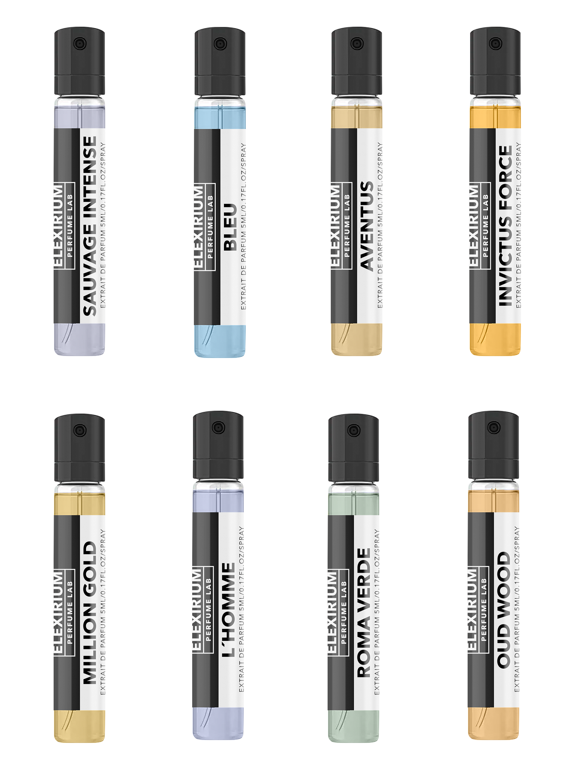 Un set de lujo con 8 fragancias icónicas masculinas y unisex en formato muestras de 5 ml con spray. Cada vial de 5 ml ofrece entre 40 y 60 usos, lo que convierte este pack en una experiencia real de uso, no simples “probaditas”.